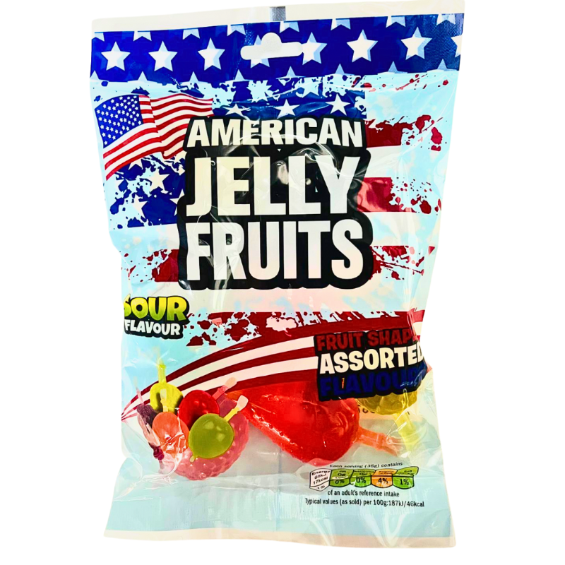 American Jelly Fruits Sour Flavors brengen kleurrijk, fruitig kauwplezier naar je snackplank! Deze populaire Jelly Fruits in fruitzakjes zijn gevuld met zure fruitgelei in intense smaken zoals aardbei, appel, druif, citroen en sinaasappel. Ze zijn populair op sociale media en bieden een pittige smaakervaring met een verrassend effect – of je ze nu eet als tussendoortje, deelt met anderen of als trending highlight op TikTok en andere socialemediaplatforms!