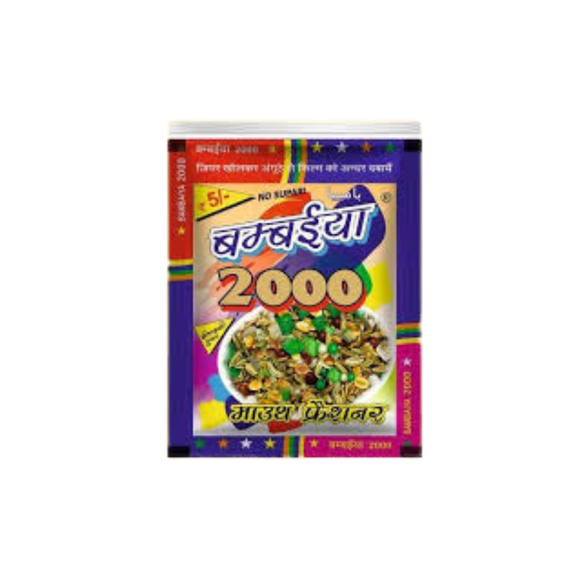 Bambaiya 2000 Mondverfrisser is een traditionele Indiase mix van aromatische ingrediënten die zorgen voor een frisse adem en een aangename smaak . Deze mix combineert zoete en pittige smaken en is ideaal na een maaltijd of als tussendoortje .